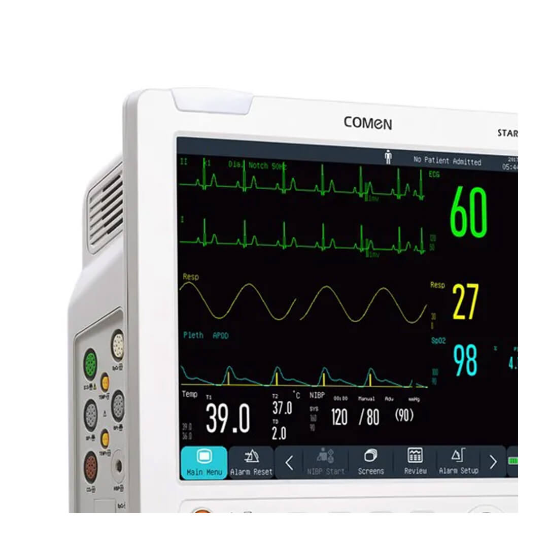 O Monitor Multiparâmetros Star8000F básico acompanha cinco parâmetros pré-configurados: ECG, SpO2, FR, PNI e Temp.